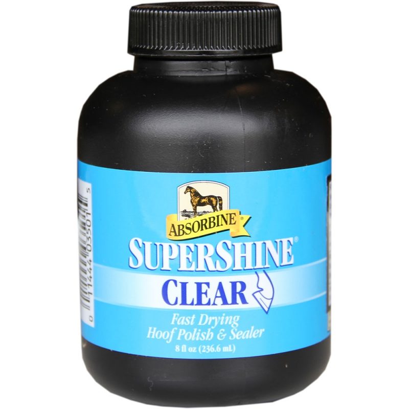 Absorbine SuperShine Hoof Polish. Supershine hoof polish by Absorbine is the choice of champions from the show rings. Quick drying, it gives the hooves a superb mirror-like finish and helps to prevent dirt and dust contaminating the show winning shine. Seals against excess moisture and hardens hooves. Will not penetrate beyond the surface of the hoof wall.