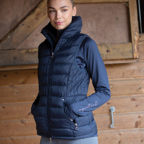 This flattering vest has just the perfect balance of comfort, design and function. The quilted panels are designed to flatter your silhouette and it's so lightweight you barely know you have it on! A timeless piece you will come back to time and time again. Feature include a padded pillow collar, two zipped outer pockets with Equetech contrast zip pullers, thermal pocket linings, curved back hem, faux down filling and Equetech badge to left sleeve as worn. Machine washable. 100% Nylon Waterproof Rating > Showerproof