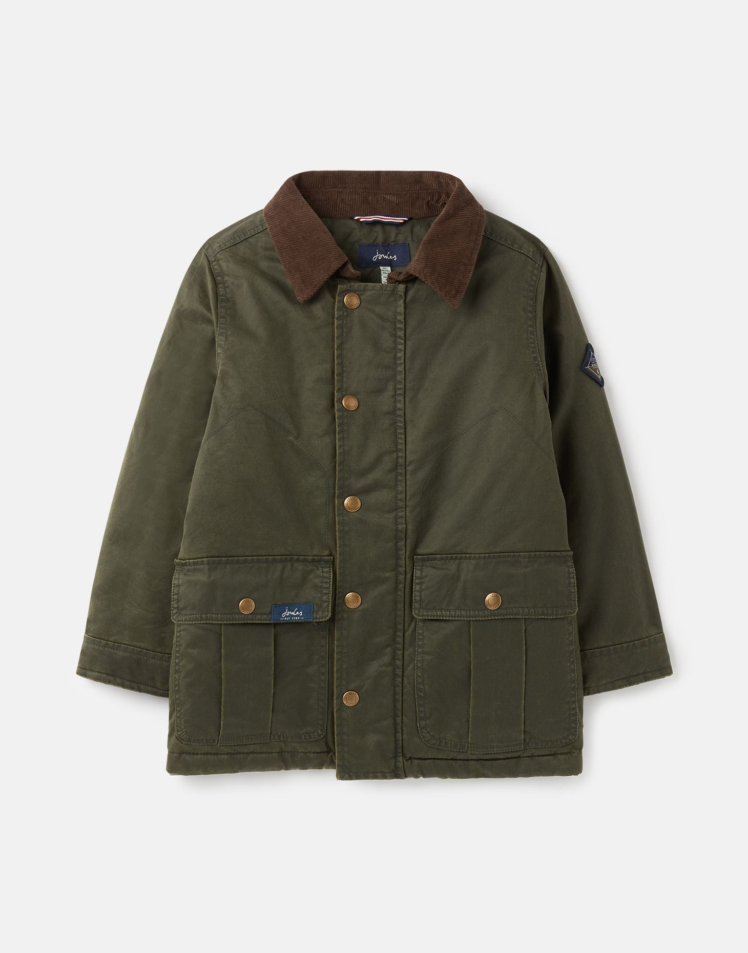This wax-style jacket is the perfect way to add a touch of country charm to your little one's wardrobe. The fabric is a faux wax which gives it that traditional polished look without the upkeep and the collar and trims are the cord you'd expect to see in a jacket like this! It's got a full zip and popper fastening, two font pockets fastened with a popper and is finished with a lining that's half checked, half quilted. We've stitched a Joules script tab to the right hand pocket (as worn), a branded badge to the left hand sleeve (as worn) and added a name label to the inside so if others at school have the same great style, he'll know which one is his!