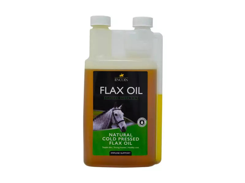 Lincoln Flax Oil is a natural, cold pressed oil, balanced in Omegas 3, 6 & 9. Also known as Linseed Oil, Flax Oil is a vegetable based oil which is easily digested & utilised by the horse. Benefits include skin support, strengthened hooves, a healthy coat & immune support. It also provides an excellent non-heating energy source for controllable energy, promoting calmer, more focused horses.