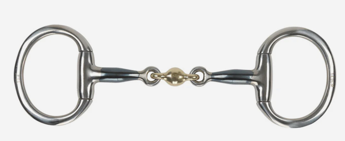 The fixed rings prevent pinching, whilst the brass alloy double joint distributes pressure over both the tongue and bars of the mouth to encourage mouthing and contact.