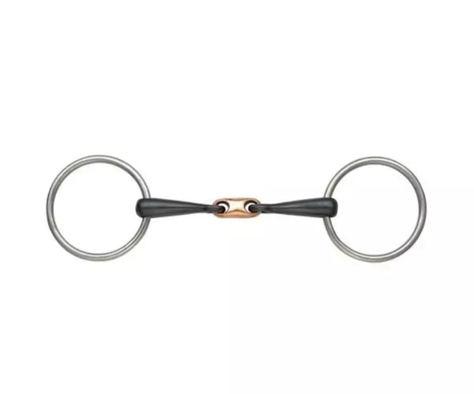 The copper and sweet iron combination used in this training bit provides a warmth for the horse which encourages salvation and gives a pleasant taste. Mouthpiece thickness 12mm, cheek height 65mm