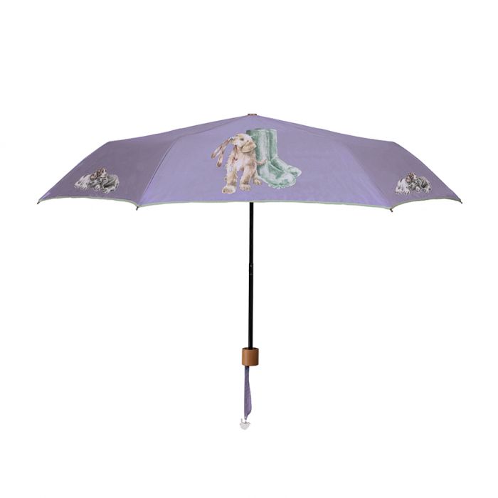 You can't make a rainbow without a little rain and this gorgeous dog umbrella will keep you dry whilst looking stylish. This umbrella is a lovely colour with contrasting piping around the trim and neatly folds into a patterned sleeve. Finished with a laser engraved logo and silver wren coloured charm on the handle makes it extra special and a wonderful gift. Made from 100% recycled polyester with a maple wood handle. Plastic free packaging. When closed the umbrella measures 240mm x 47mm.